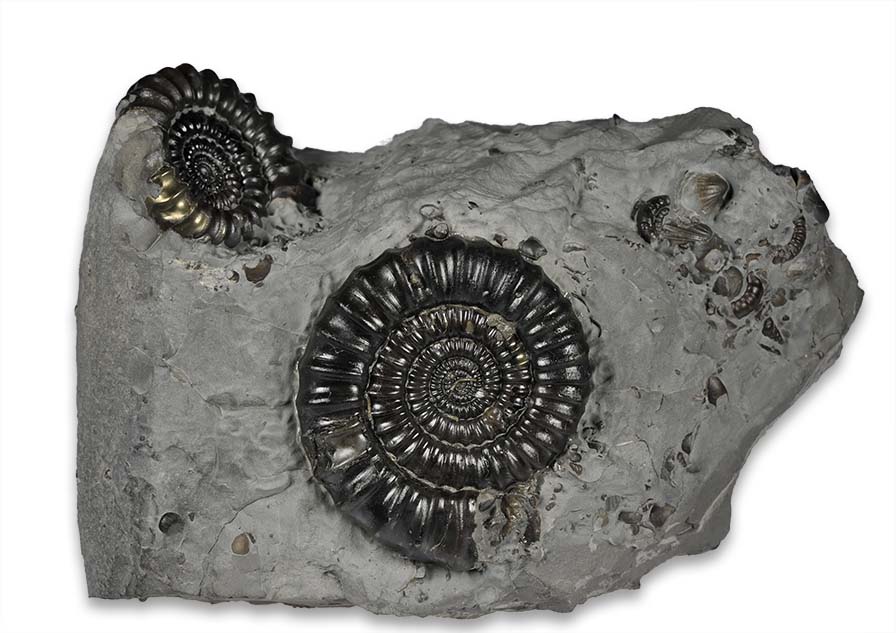 Balanocrinus gracilis, ossicles with juvenile Amaltheus (1 cm diameter) ammonites