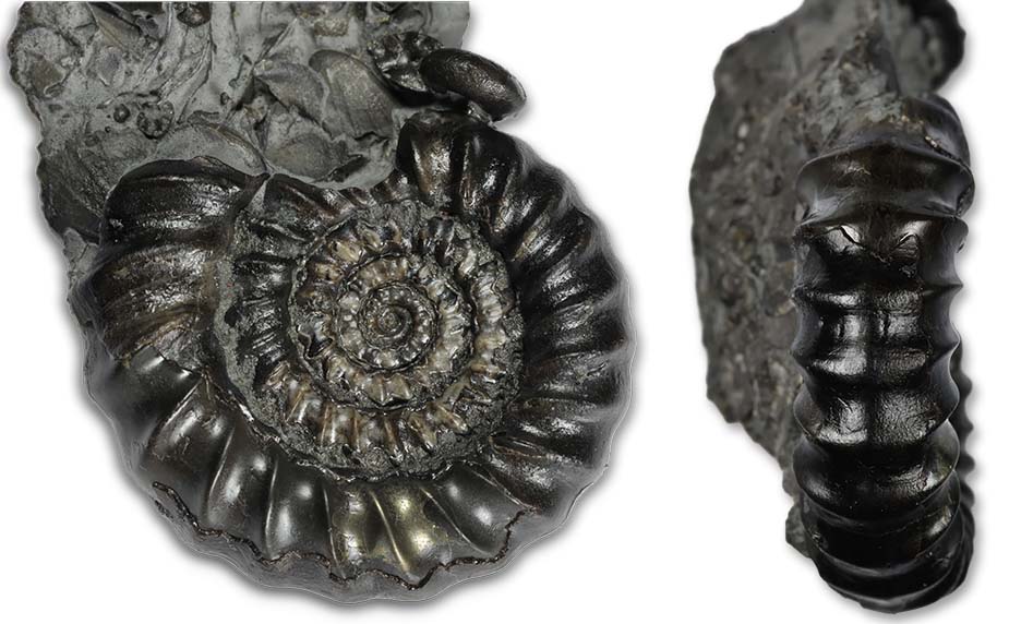 This beautiful section of a piece of solid black jet with a juvenile crinoid anchored to it was kindly given to me by a friend. It gives more evidence to the observation that some crinoids have used floating logs for anchoring themselves to during their lifetime and filter fed in the surface waters.