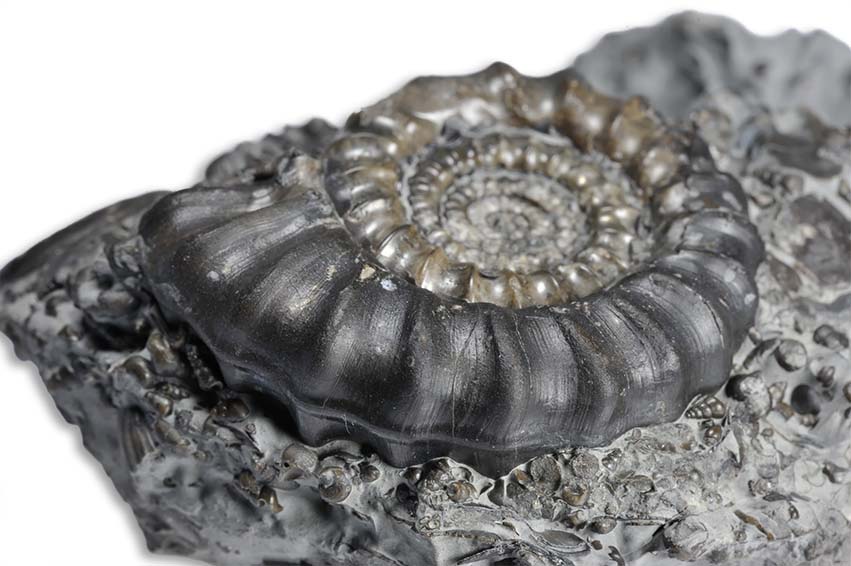 Their delicate structures are usually firmly embedded in the sediments and can only be retrieved if there is a difference between the surrounding matrix and the fossils which are usually preserved as calcite or pyrite. This difference can either be a difference in hardness, when the fossils are harder than the matrix – these fossils can be prepared mechanically, i.e. needles, airpens or – you might have guessed – air abrader. If there is no difference in hardness, there can also be the option of chemical preparation – when the fossils are more resistant to certain chemicals like acids or alkaline solutions than the matrix. In rare cases, the environment (or rather what we put into it – sulphur dioxide / nitrogen dioxide from burning fossil fuels reacting with water to form sulfurous/sulfuric resp. nitric/nitrous acid) or certain naturally occuring humic acids can do the job for us – but that is only really the exception.