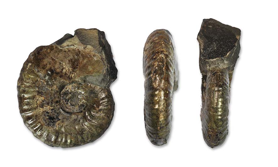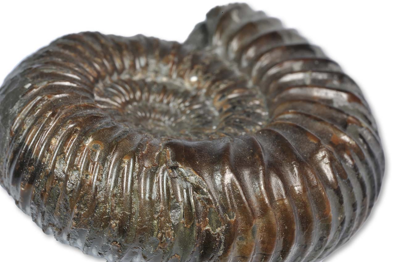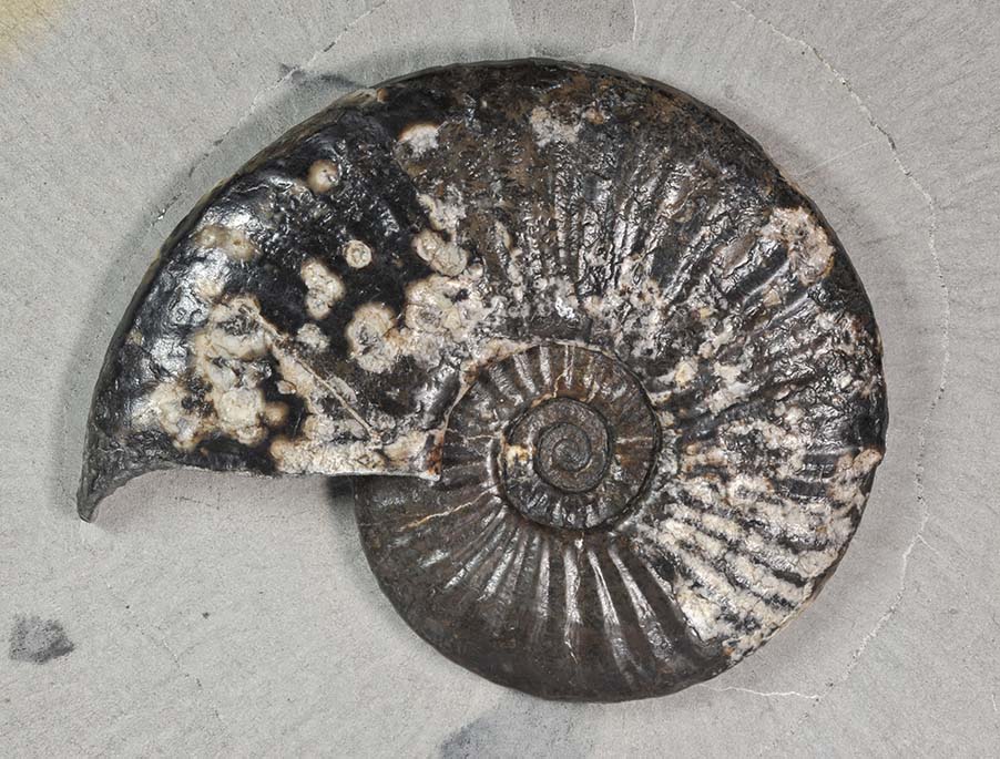 A relatively common pathology : A bivalve or worm settled on the shell and was overgrown by the ammonite – a typical “bend” is created.
