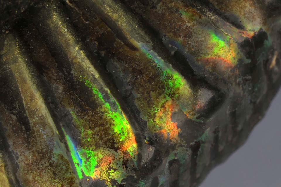 In some rare occasions, a little bit of the original shell of an ammonite is preserved and shows all the colors of the rainbow due to an effect called iridescence, thin film interference on the fine layers of shell material.