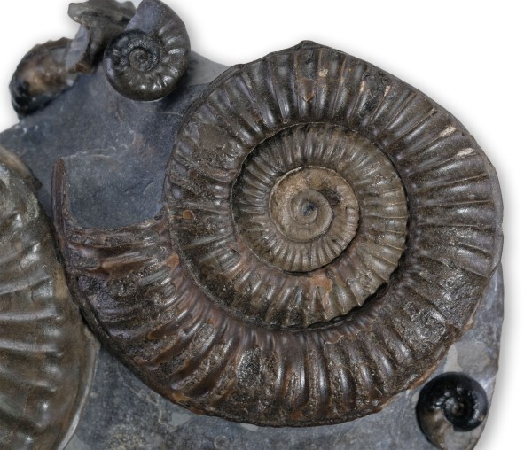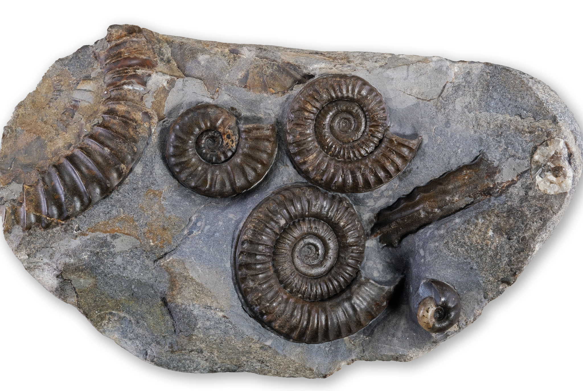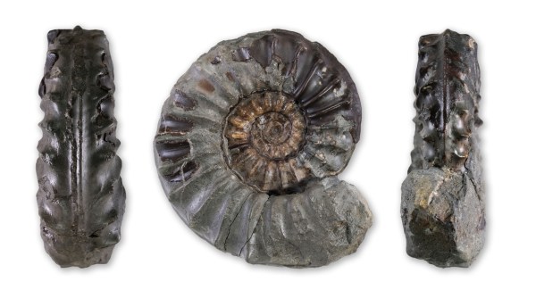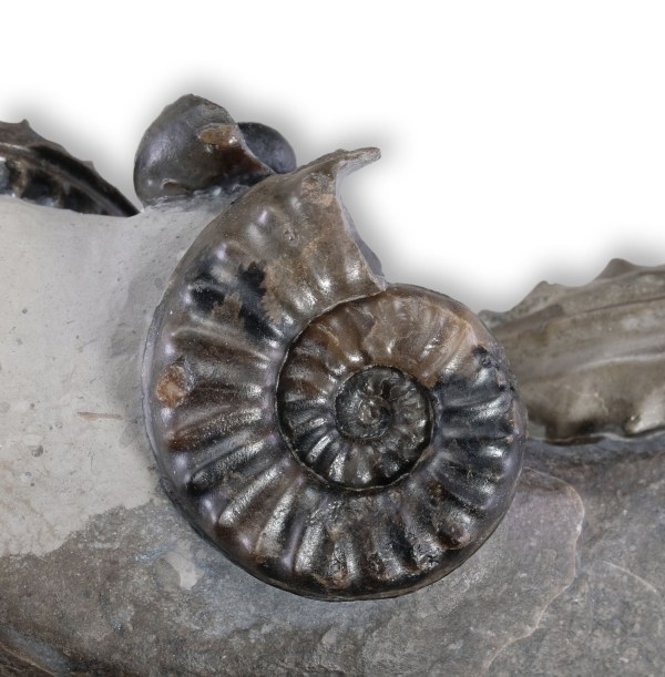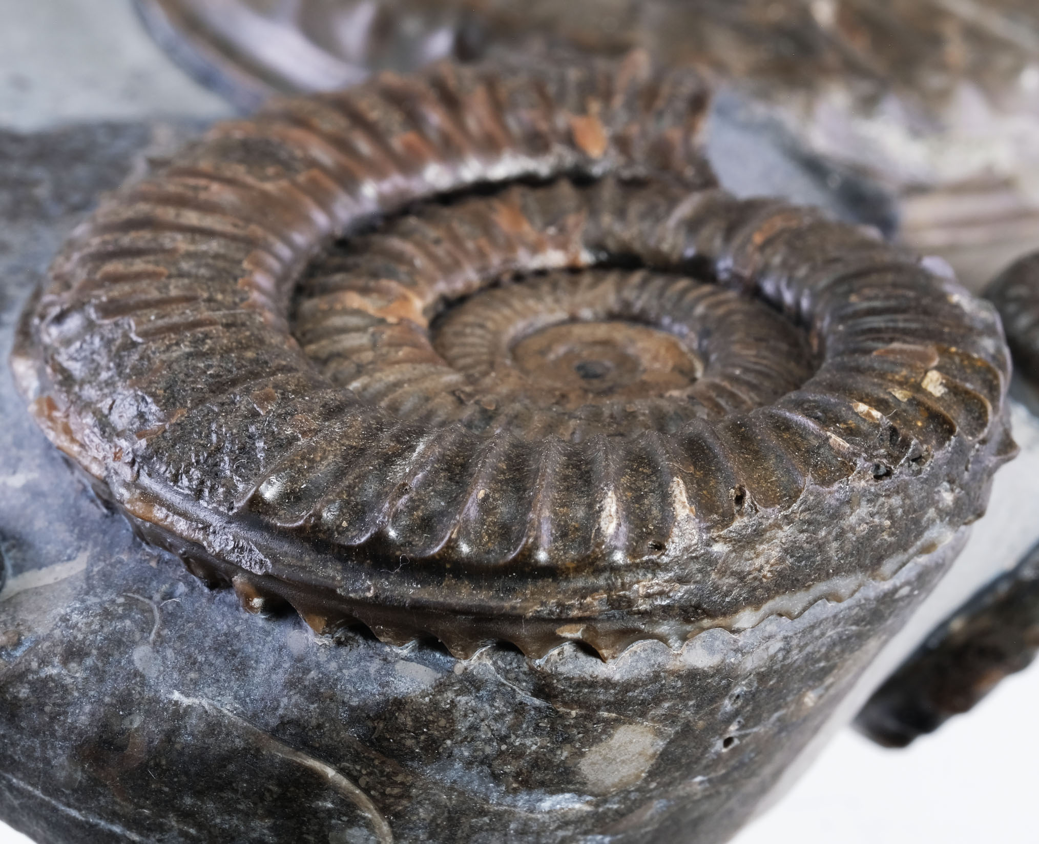 The Arnioceras ammonites (35 and 25 mm) on this multi are also Arnioceras ceratitoides, and the small ammonite on the left (21 mm) is most also a Coroniceras lyra – compare the odd splitting of some of the ribs from a small node at the umbilicus into two ribs.