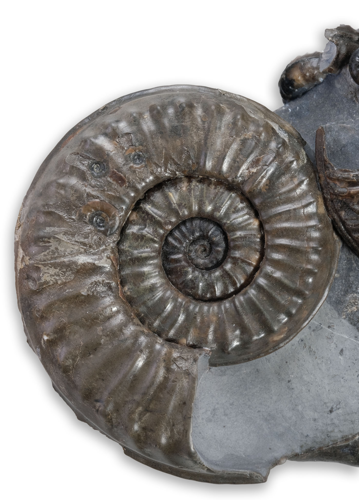 As a bonus, the Coroniceras shows a few smaller ammonites (which I assume are Arnioceras as well) washed into the body chamber, and just visible inside the internal mould.