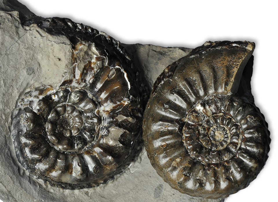 The ammonite at 40 mm diameter is a mostly complete adult, as the crowding of the sutures